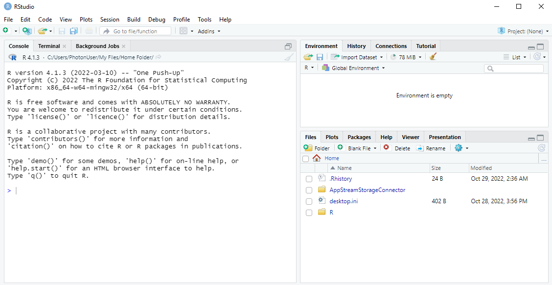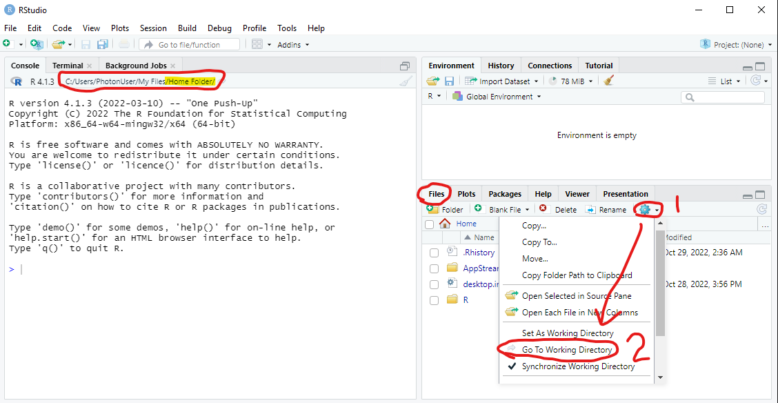 - By default, the "Working Folder" of this RStudio AppStream will start in the Home Folder. To avoid confusion, it's usually a good idea to make the "Files" pane also show the Home Folder.